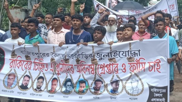 বাজিতপুর, প্রতিনিধিঃ কিশোরগঞ্জের বাজিতপুর উপজেলার কৈলাগ গ্রামের জূলাইযোদ্ধা রাকিব হত্যার আসামিদের দ্রুত গ্রেফতারের দাবিতে মানববন্ধন অনুষ্ঠিত হয়েছে। আজ বৃহস্পতিবার (১১ সেপ্টেম্বর) সকাল ১১টায় বাজিতপুর বাজার বাসমহল এলাকায় এ মানববন্ধনের আয়োজন